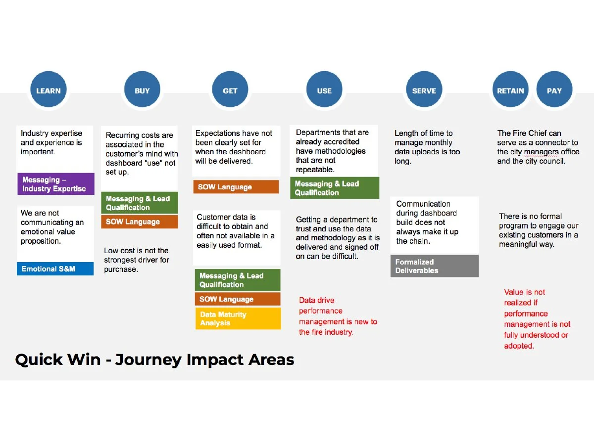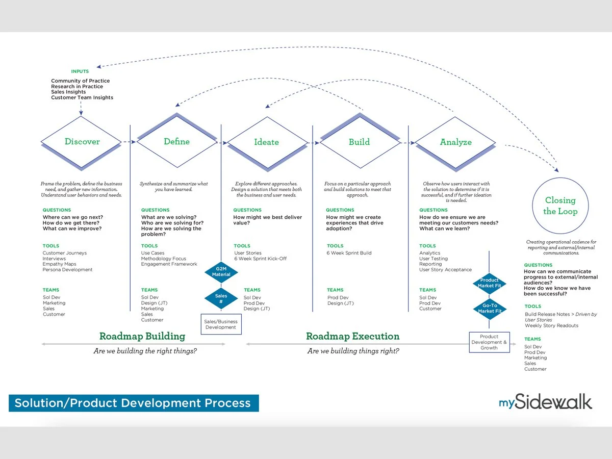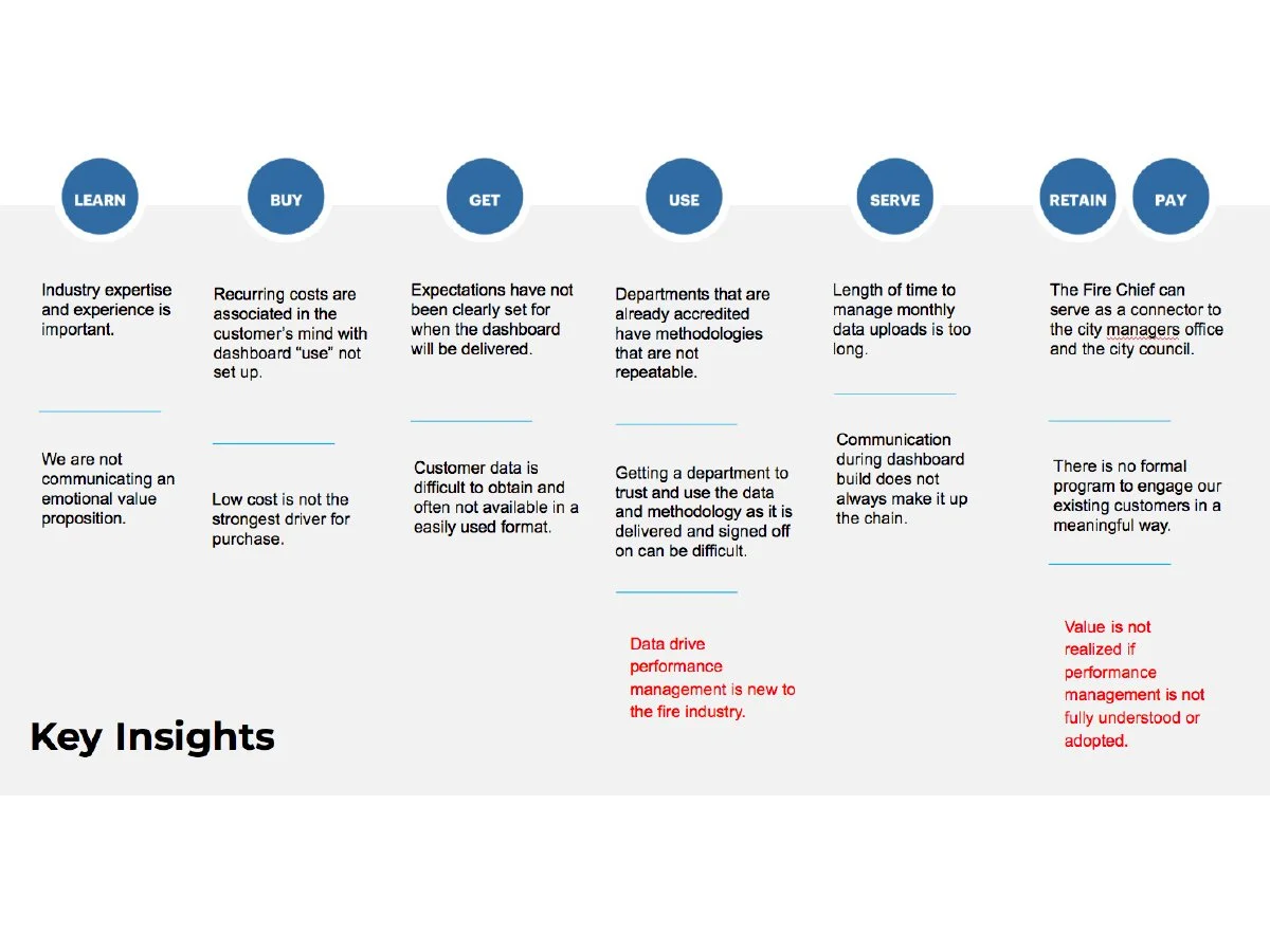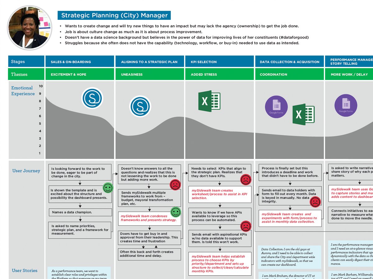 AS the VP of strategy for mySidewalk I leveraged human-centered design best practices to improve the overall UX approach for product development. In addition, I established a framework for measuring the go-to market, product-market fit, and growth trajectory of our product lines against customer journey phases and key user journeys. This framework was leveraged to improve UX, marketing, sales and customer experience initiatives across company product offerings.